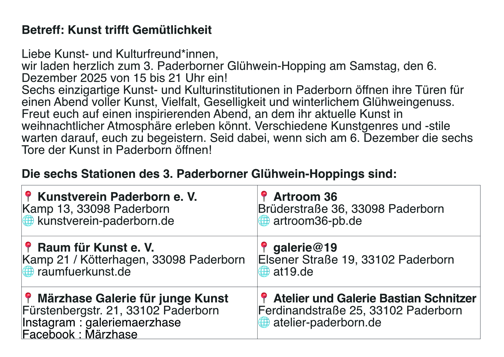 wir laden herzlich ein zum 3. paderborner glühwein-hopping am 6. Dezember2025. @19 ist auch in diesem jahr dabei.